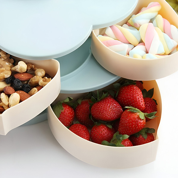 Dwuwarstwowy pojemnik, który otwiera się jak kwiat, ułatwia organizację kuchni i oszczędza miejsce.